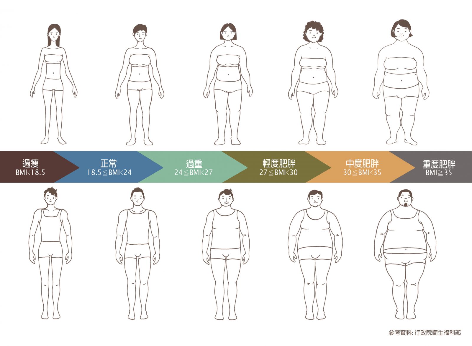 根據行政院衛生福利部公佈的成人肥胖標準,BMI在18.5到24之間最標準,而BMI超過27以上則屬於肥胖;若女性體脂率大於30%,男性體脂率大於25%,尤其是脂肪集中在腹部的人,發生心血管疾病的危險性會增加許多。